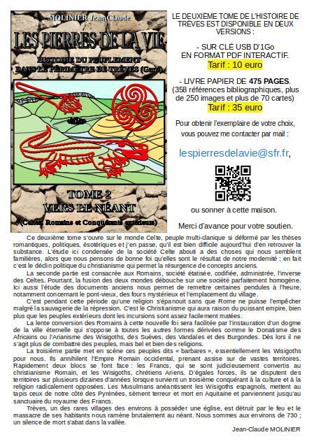 LE PREMIER TOME DE L’HISTOIRE DE TRÈVES EST DISPONIBLE EN DEUX VERSIONS : - SUR CLÉ USB D’1Go EN FORMAT NUMÉRIQUE : FICHIER EBOOK ET PDF. Tarif : 5 euro OU 1 carnet de 12 timbres envoi normal. - EN LIVRE PAPIER DE 266 PAGES. Tarif : 20 euro OU 2 carnets de 12 timbres envoi normal. Pour obtenir l’exemplaire de votre choix, vous pouvez me contacter sur la boite mail suivante : lespierresdelavie@sfr.fr, ou sonner au 8 rue de la Poste, Lou Cantou à TRÈVES. (MAISON FACE À LA GENDARMERIE AVEC UNE VÉRANDA)